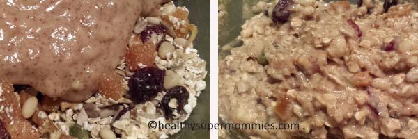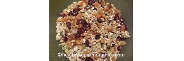 En un bowl mezclar bien los ingredientes secos: albaricoques, arándanos, nueces, semillas y avena.