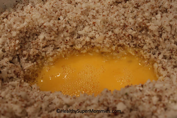 Mezclar la mezcla del coliflor, oregano, sal y pimienta con el huevo y las claras y formar una masa.